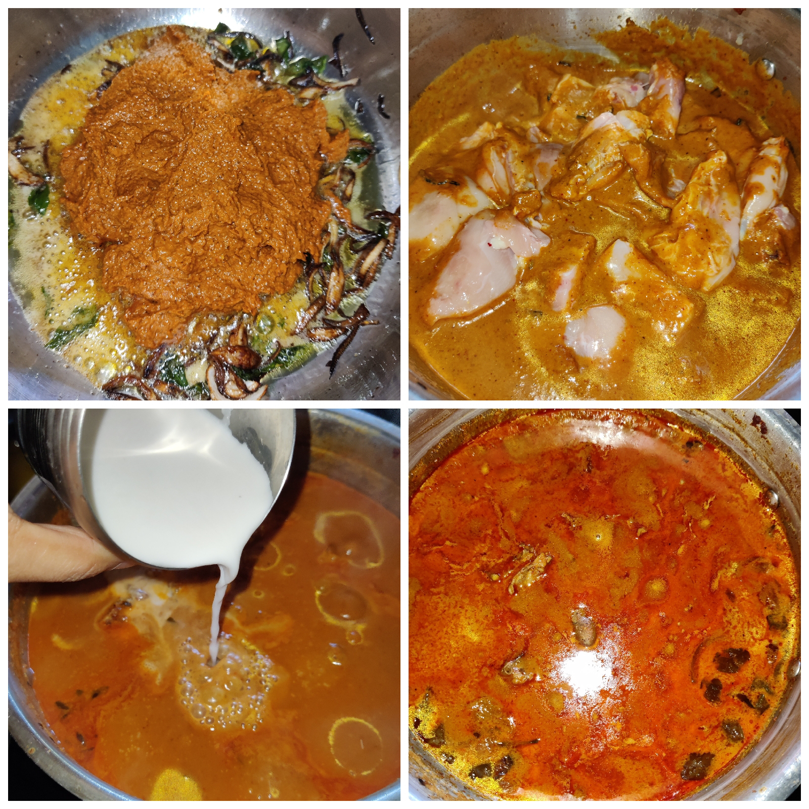 Add ground masala fry. Add cleaned chicken pieces, thin coconut milk, masala water & boil.